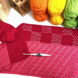- Using the yarn weight and hook noted below, one filet CAL block is 18 x 20 inches (46 x 51 cm) and your finished 9-block blanket will be 55 x 61 inches (138 x 155 cm), excluding the pom-pom fringe.